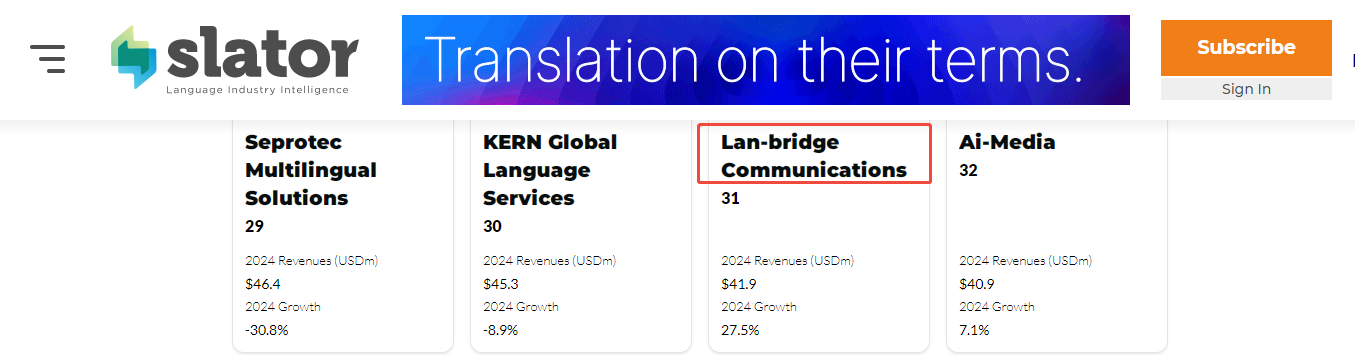 根據(jù)四川日?qǐng)?bào)報(bào)道,語(yǔ)言橋已成功入選國(guó)家語(yǔ)言服務(wù)出口基地。根據(jù)CSA國(guó)際權(quán)威排行,語(yǔ)言橋已連續(xù)多年入選 CSA Global Top 50 語(yǔ)言服務(wù)供應(yīng)商。2025年,在國(guó)際權(quán)威第三方機(jī)構(gòu)——Slator發(fā)布的"The Slator 2025 Language Service Provider Index"(2025年語(yǔ)言服務(wù)提供商指數(shù))中語(yǔ)言橋位列全球翻譯服務(wù)提供商第31位。與此同時(shí),語(yǔ)言橋已榮獲ISO9001:2015質(zhì)量管理體系認(rèn)證、國(guó)家高新技術(shù)企業(yè)、翻譯協(xié)會(huì)會(huì)員、AAAAA級(jí)筆譯服務(wù)認(rèn)證、AAAAA級(jí)口譯服務(wù)認(rèn)證、亞太地區(qū)語(yǔ)言服務(wù)提供商TOP10、全國(guó)優(yōu)秀翻譯服務(wù)企業(yè)等多項(xiàng)殊榮。